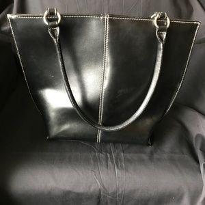 Wilsons leather bucket purse. 10” tall, 12” wide at top and 8.5” at the bottom. Clean white stitching. The inside has a zippered pocket on one side and credit card slots, Pen holder and small pocket on the other side. Magnetic snap closure.