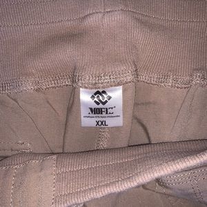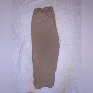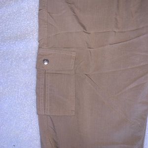 Super cute cargo pants by Mofie. Side pockets with silver button detailing. Stretchy waist band and bunched up at the bottom. Very cute look that could be dressed formally and casually.