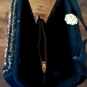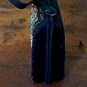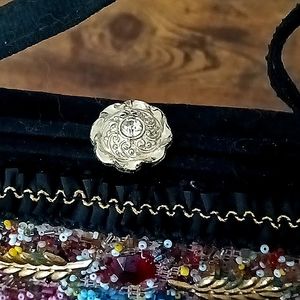 Gorgeous, colorful vintage box purse. Black body, the front in full of beads, in red, yellow, green, white, blue, clay, black, clear..two gold tone leaves at top, ted stone in between, two shiny stones at bottom. Bezel set rhinestone flower closure, Silverstone on top. Clean interior. The front has a net in beige, there are beads scattered around , on it, and hand stitched colorful yarn in a pattern . Gross grain ribbon around frame with gold color thread. Inside zipper middle compartment. Hand decorated by Caron, of Houston Texas. Reasonable offers welcome.💐 Just reduced FINAL MARKDOWN.💋