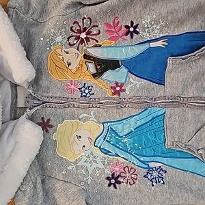 EUC: Disney Store Exclusive Frozen Sparkly Grey Zip Up Hoodie. Make your little princess' dreams come true with this sparkly grey zip up hoodie featuring Disney's favorite sisters, Elsa & Anna, surrounded by sparkles, sequins and lovely embroidery. also features a faux white fur trim around the hood.