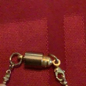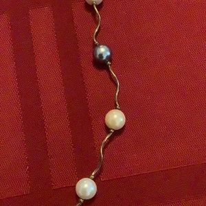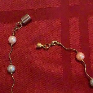 Beautiful ladies necklace measuring about 19 inches. Has pearl like beads strung between wavy metal pieces and a magnetic clasp. In excellent condition.