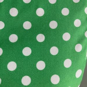 Super cute green and white polka dot summer dress with pleats around the waist of the dress. The hem falls below the knees. Perfect for summer!!