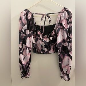 A smocked panel decorates the cropped hem of a gorgeous blouse featuring a square neck and dainty tie back. Square neck. Long sleeves.
