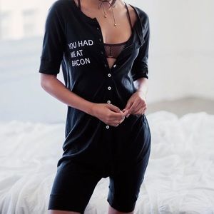Daydream Nation Bacon Unisuit tell ‘em the key to yer heart, bb. This black unisuit has mid-length sleeves and legs, and button-up front, a dropped crotch, and white “You Had Me At Bacon” text on the front chest.