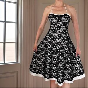 Adorable, black and white lace party dress. Very figure flattering with small waist about 27/28. Just about ankle length on 5’5” gal. Light crinoline lace underneath. Strapless or halter strap around neck. Excellent condition.