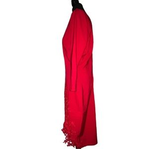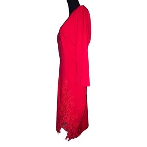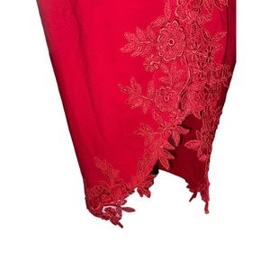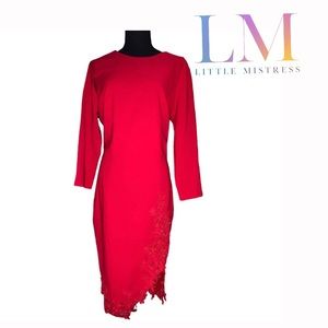 Beautiful NWT Little Mistress Red Lace Trimmed 3/4 -long Sleeve Formal Dress. Perfect for any formal event like a wedding or birthday. Has zipper closure in the back with a deep v detail on the back and a high, round, neck line in the front. with beautiful lace detail along the hem and the split in the front.9% Spandex so it has great strength