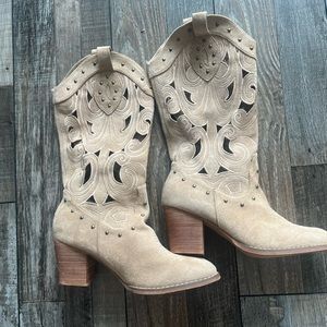Suede tan cowgirl boots with cut outs and white stitching. Adorable boho vibes. Never worn but look soo cute on! Never worn! Size 8