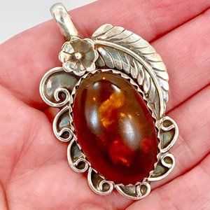 What a fabulous, large statement pendant! This is a vintage sterling silver pendant that is set with a big piece of polished honey amber. This is a stunning piece and features a lot of sterling silver work. The amber is a warm honey color. The oval amber cabochon rises up high from the bezel settings to catch the light. It is a Native American Navajo handcrafted pendant. The amber is bezel set in a wide sawtooth bezel. The amber is framed with a curled wire, scalloped design. A dimensional sterling feather and flower adds more detail. It has a nice size bezel. It is large enough to slip onto a strand of beads, leather or chain. This is signed G by the artist. Beautiful piece! Beautiful piece to add to your collection!
