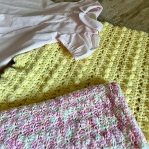 This is a precious set of a dress and two crocheted blankets. Please see all pictures and the video for item description and specifics. Pink blanket is brand new yellow blanket is an excellent condition and the little dress is new without tags but it does have a small little spot that I’m sure will come out washing and I did picture it.