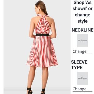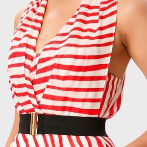 Red and white stripe voile halter back dress. Dress is knee length, lined in light cotton voile with gripper at bodice. Has cinch waist using belt. Side pockets. Pleated surplice bodice. Low V neck with cross back with keyhole bodice. Cut away sleeves.Back zip with hook and eye closure. Full flare skirt. No stretch and very light weight