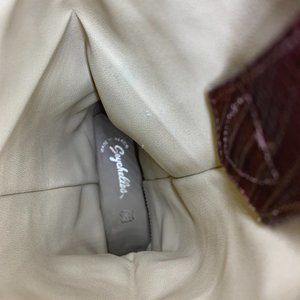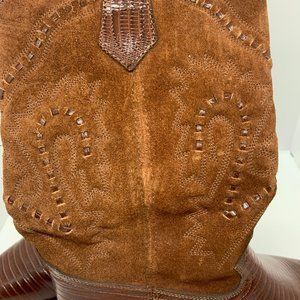 Vintage Seychelles Western Brown Leather Cowboy Boots with leather animal skin texture on foot. Suede scroll up the boot.