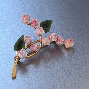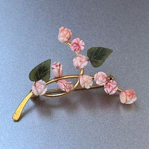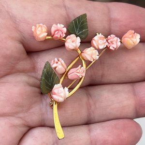 Vintage Swoboda Carved Coral Flowers & Jade Leaf Brooch, 2" Long, 10 Roses