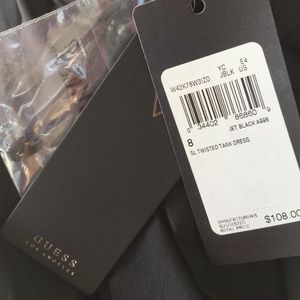 NWOT Guess Twisted Tank Dress Black Size 8. Features hanky hem, twisted sleeves, mesh back, jet black.