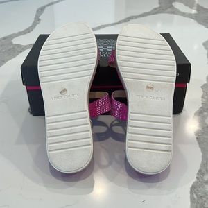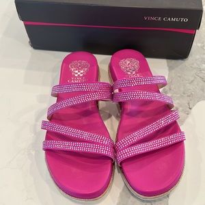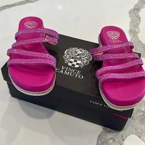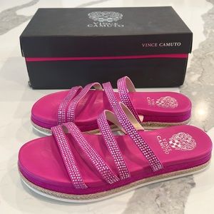 NIB Vince Camuto espadrille style sandals in color “Fireball Fuchsia”. Made with Liz kid suede, jute lining around the sole and rhinestones along the straps.