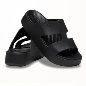 Soild black swim suit. Ruffle details along front through straps. Crisscross tying back detail. Removable padding on top
