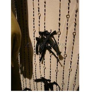 Style : stylish cut design and looks incredible, black satin pleated halter style straps at neckline, silver rhinestone bow at center front, exposed silver zipper down back, black and silver beads in vertical stripes decorate hem, clusters of black ribbon bows with jet bead centers scattered at bottom, black satin at hem, comes with its hanging Bergdorf Goodman department store tag, it is a gorgeous 6267 dress that is very stylish and attention grabbing