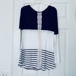 Long tunic - navy and white color block. The lace on the back is beautiful! Tunic top is long-sleeves, and hits just under the hips. Perfect with leggings and boots! Smoke-free, pet-free home.