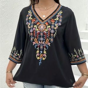 Shoulder: 18.5 inch, Bust size: 53.6 inch, New Boho embroidered 3/4 sleeve top is lightweight and great to tuck in or wear out. Beautiful colors accent the rich black background.