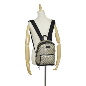 The GG Supreme backpack features a coated canvas body with leather trim and embossed bees designs, a flat leather top handle, flat back straps, a two way top zip closure, an exterior zip pocket, and an interior zip pocket.