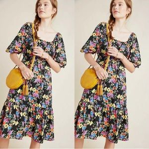 Forever femme in a gorgeous floral print, this drapey dress is featured in a stunning, tiered silhouette with ruffle-adorned detailing and button-front closure for added versatility.