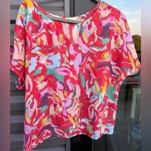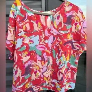 This is a strikingly vibrant short-sleeved top in red, pink, mustard, aqua, purple and white. It provides a bit of coverage for you when wearing a sleeveless dress or low-cut top. Sheer, lightweight and striking, adding this to your outfit will not mean a thick layer, just a bit of coverage.
