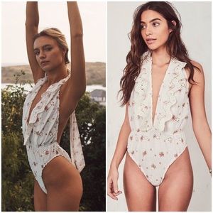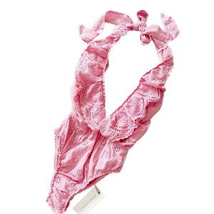 Fairy goddess meets French boudoir chic in the Peony Suit in floral eyelet cotton. A cascading flounce frames the plunging v-neckline, which ties at the back of the neck, halter style.