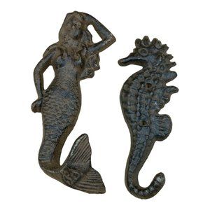 Beach Decor Coat Hat Wall Hooks Cast Iron Mermaid & Seahorse