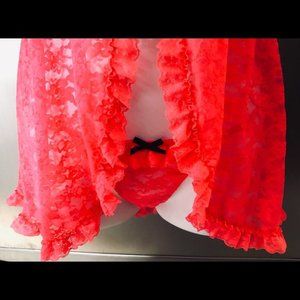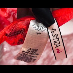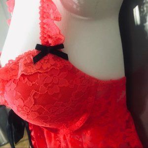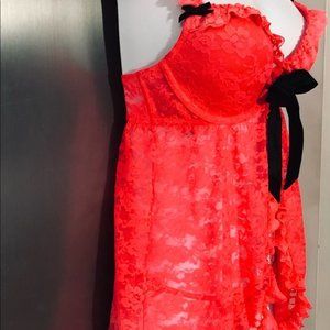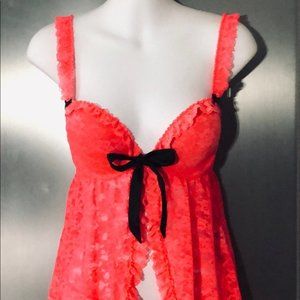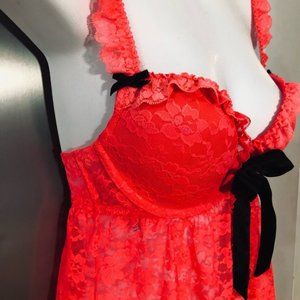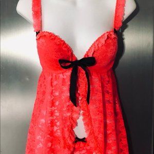 💕La Senza Hot Coral Padded Push Up Bra Lace Babydoll Lingerie w/Panties S NWOT💕