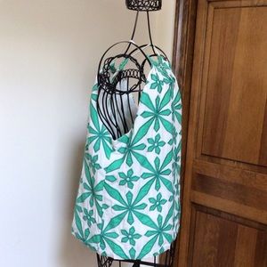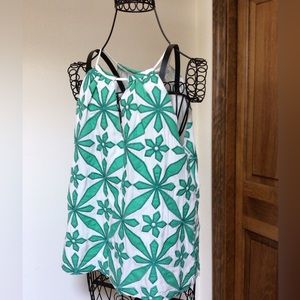 Skies are blue halter style top. Embroidered top. Keyhole at neckline. Fun green embroidered design on white background