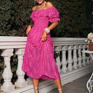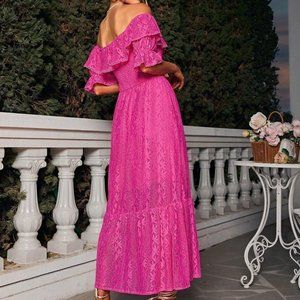 Pink Boho Womens Off Shoulder Ruffle Trim Lace Dress
