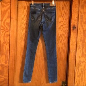 Hollister High Rise Super Skinny Jeans with Patches, size 0 / 24. Has 5 pockets. Rise 9.75" - 10". Inseam 30". Interlocking patches are on left thigh & right knee, + one on back pocket. Stretchy comfortable 66 cotton, 21 poly, 12 viscose, 1% elastane for a perfect flattering fit. Original retail $58. In very nice condition. Ships promptly from non-smoking home. (#7071)