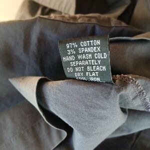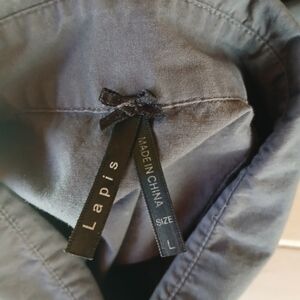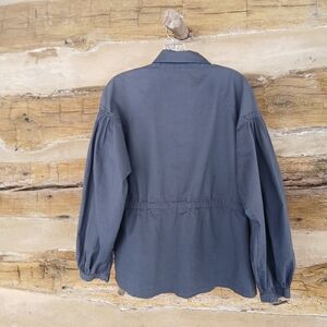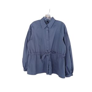 Lapis gray button down shirt with balloon sleeves and a drawstring waist made of 97% cotton and 3% spandex. It measures approximately 23" from pit to pit, 21" between shoulder seams, 21" sleeves, and 27" in length. Good used condition, size large.
