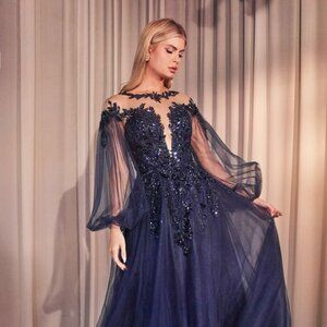 Long Formal Evening Dresses with v-neckline, sleeveless dress, open back with zippered closure, a-line shape.