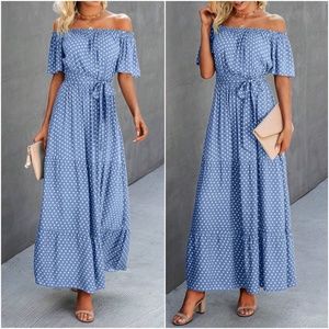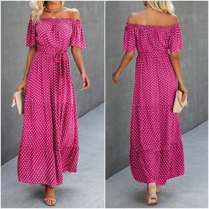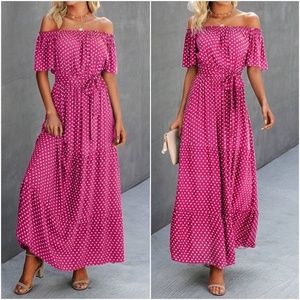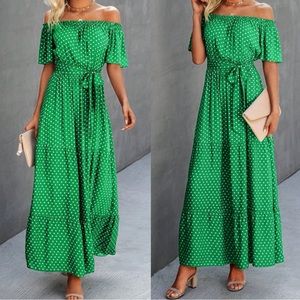 Off Shoulder Polka Dot Butterfly Sleeve Belted Maxi Dress