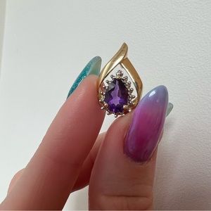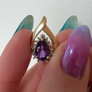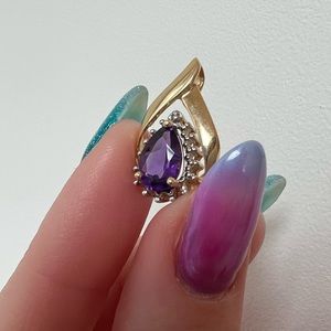 One 14 karat yellow gold and purple amethyst pendant (stamped 14K). The center stone is a pear-shaped purple amethyst that is estimated to be approximately 1.15 carats and is AAA quality.
