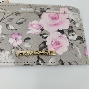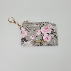 Rampage Floral Gray & Pink Card Holder Keychain ID Card Holder Zip Up Coin Purse. NWOT. Approximately 5 inches x 3 inches. Clip works. As shown the stitch on one part is a little weird but is how it came, does not effect the function and hard to notice. 5 slots to slide in cards and one zipper compartment.