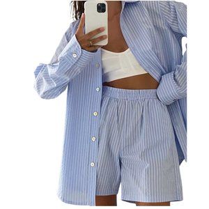 Blue Striped 2-Piece Long Sleeve Shorts Set - Size Small - NWT