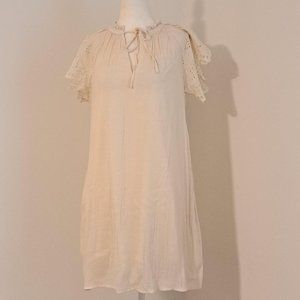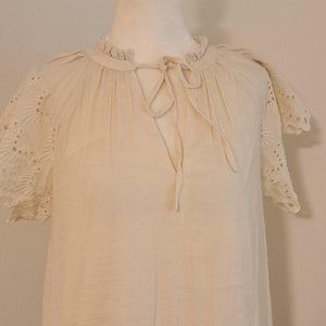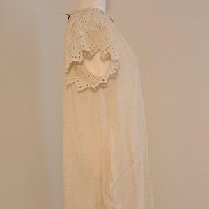 Who What Wear Eyelet Lace Flutter Sleeve Dress Size XS NWT. Beautiful off-white/cream color, keyhole opening at neckline with tie at neckline. Lined. Shell: 66% Rayon/34% Polyester. Lining: 100% Cotton. Measurements: Shoulder to shoulder laid flat - 14", Bust - 35" - 36", Dress Length from Shoulder to Hem - 35" . Dress is true to size.