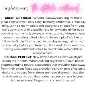 • Our 2 in 1 pacifier clips are not only great for pacifiers, but their universal design can also be used on 99% of small toys, teethers, lovies, nuks, MAMS, bibs, clothing, blankets / blankies, strollers, snack cups, cups etc. Really anything that has a hole/loop where they can be fed through! The secure clasp is gentle on clothes while also being strong enough to not fall off every time the baby gives it a tug. Easy to attach, super cute & stylish; functional baby fashion at its best! A must-have registry item for all moms & dads!