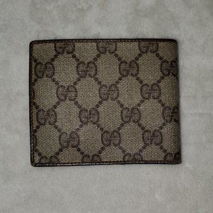 EUC pre-loved and authentic Gucci Accessory Collection bi- fold wallet in GG supreme coated canvas. But slight tarnish of logo on front of wallet interior pockets of the wallet are clean. Features 4 slots for card inserts, cash and coin pockets, and an extra hidden pocket.