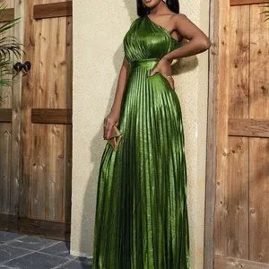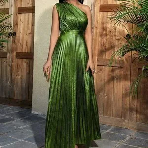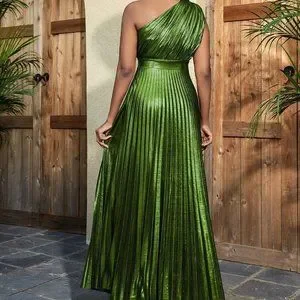 Green Boho Womens One Shoulder Pleated Hem Dress
