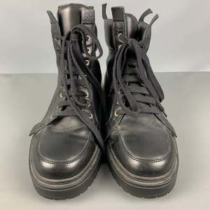 KRIS VAN ASSCHE ankle boots comes in a black solid leather featuring a leather trim details, lace up, a back zipper, and thick sole.