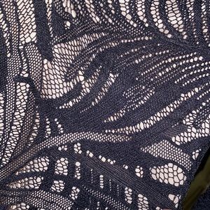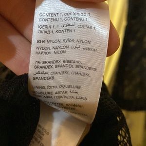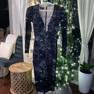Bebe Black Lace Dress Tan Underlining Low Cut lowcut V-Neck Longsleeve Underlining falls right below knee, lace falls about mid calf