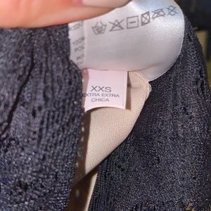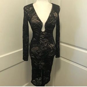 Bebe Black Lace Dress Tan Underlining Low Cut V-Neck Longsleeve lace sleeves XXS