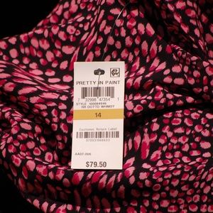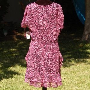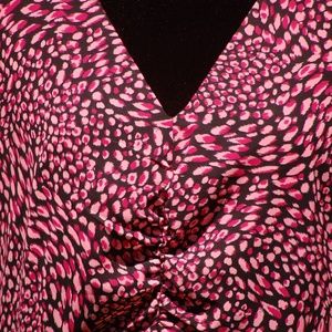 A-line silhouette Back zipper closure Short drawstring sleeves Allover print; ruched at front bodice; ruffled chiffon