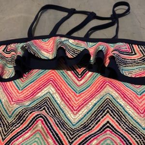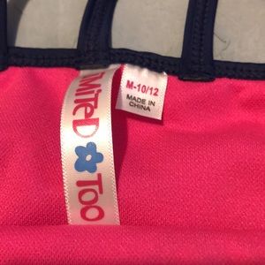 One piece girls swimsuit. Size M - 10/ 12 . 18 inches from shoulder to bottom, 12 inches from armpit to armpit. Shell exterior 82% nylon polyamide ,Lining 100% polyester. Colors pink , blue , orange .