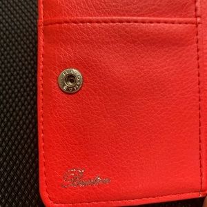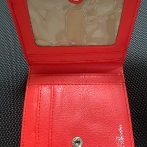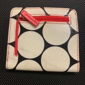 White large polka dots with black background. White border with silver bow wallet. Exterior zipper pocket. Lots of pockets for cards. Barely used. Great condition.