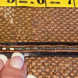 A row of sterling silver beads sits in between two rows of round tan leather cord!