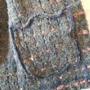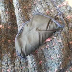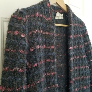 Beautiful 100% pure virgin wool vintage Cardigan with two front pockets. A gorgeous color blend of rose pink, purple toned navy, and a dark grey blue.