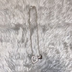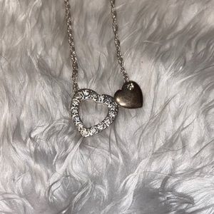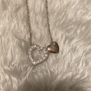 Women’s gently used silver hearts necklace. Two hearts combined together, one has diamonds.